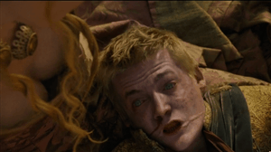 [En la escena parece que puedan ser ambas, almenos al principio. Luego vemos un plano de Tyrion mirando la copa de vino de Joffrey y allí ya no queda duda. Para terminar, ¿como viste la interpretación de Jack en el canto de cisne de Joffrey?]